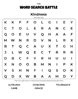 Enjoy our free Kindness Word Search puzzle online in real-time battle with your friend, or play a classic single-player game. There are easy, medium, and hard difficulty levels for new and advanced players.